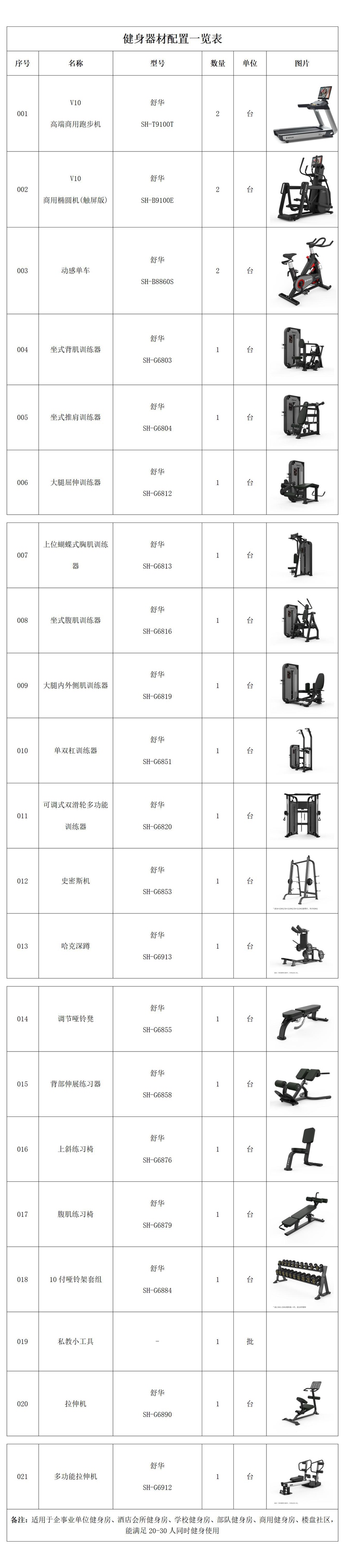 此方案要求面积小于150平米,适用于企事业单位健身房、酒店会所健身房、学校健身房、部队健身房、商用健身房、楼盘社区,能满足20-30人同时健身使用。