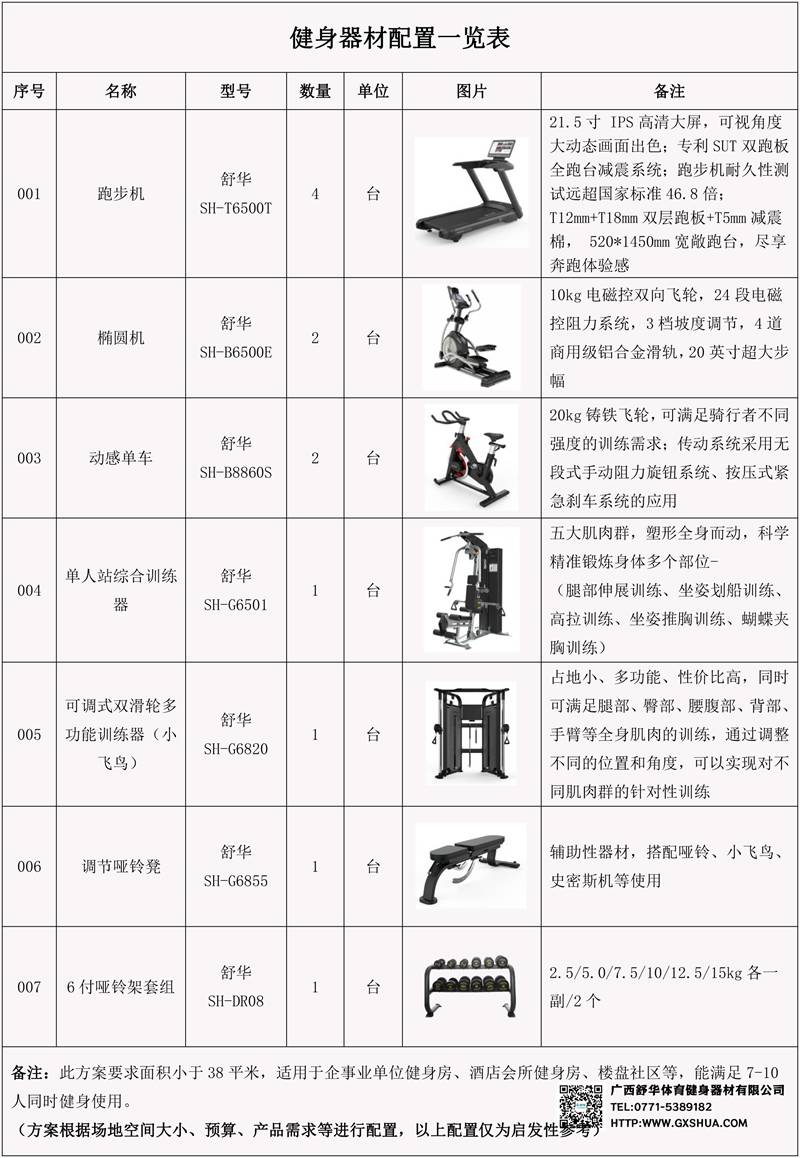 此方案要求面积小于86平米,适用于企事业单位、酒店会所、楼盘社区、学校等健身场所,能满足10-15人同时健身使用。(方案根据场地空间大小、预算、产品需求等进行配置仅为启发性参考)