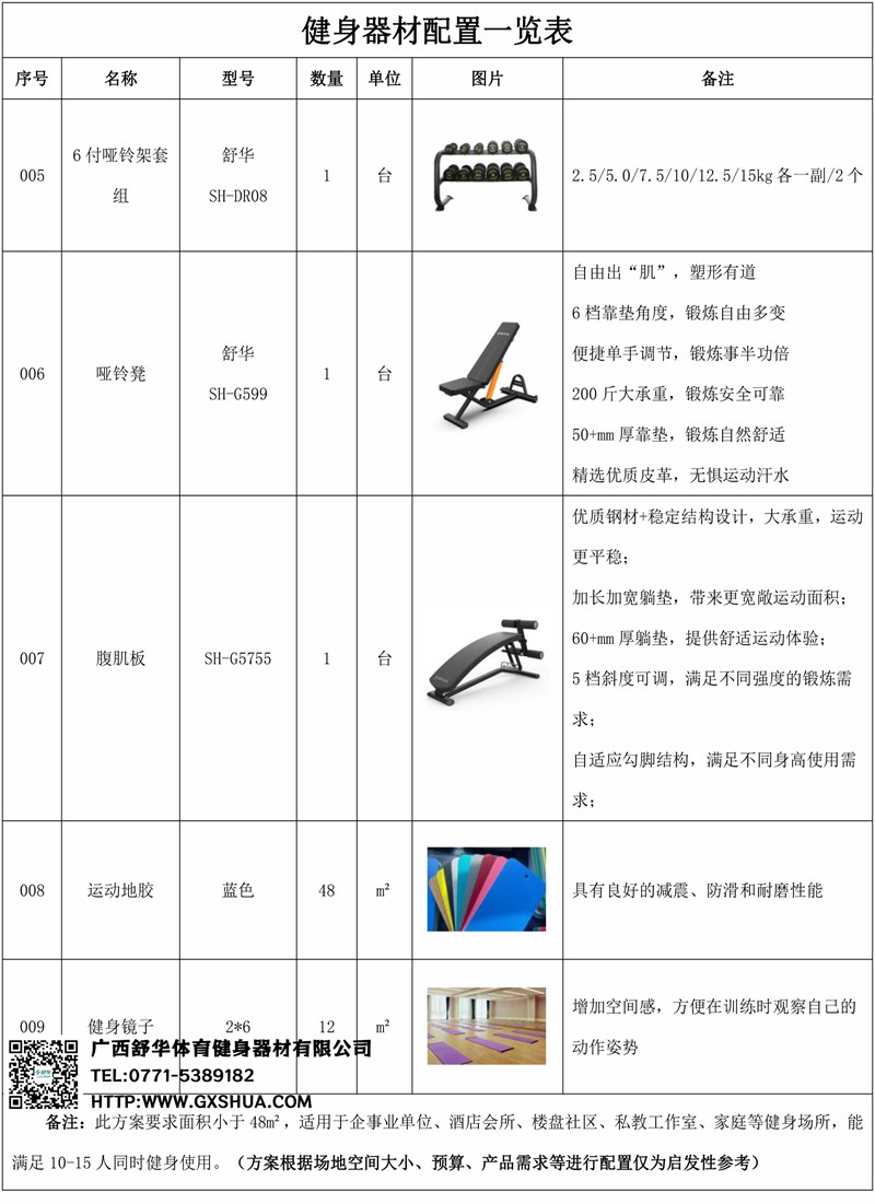 此方案要求面积小于48m²,适用于企事业单位、酒店会所、楼盘社区、私教工作室、家庭等健身场所,能满足10-15人同时健身使用(方案根据场地空间大小、预算、产品需求等进行配置仅为启发性参考)