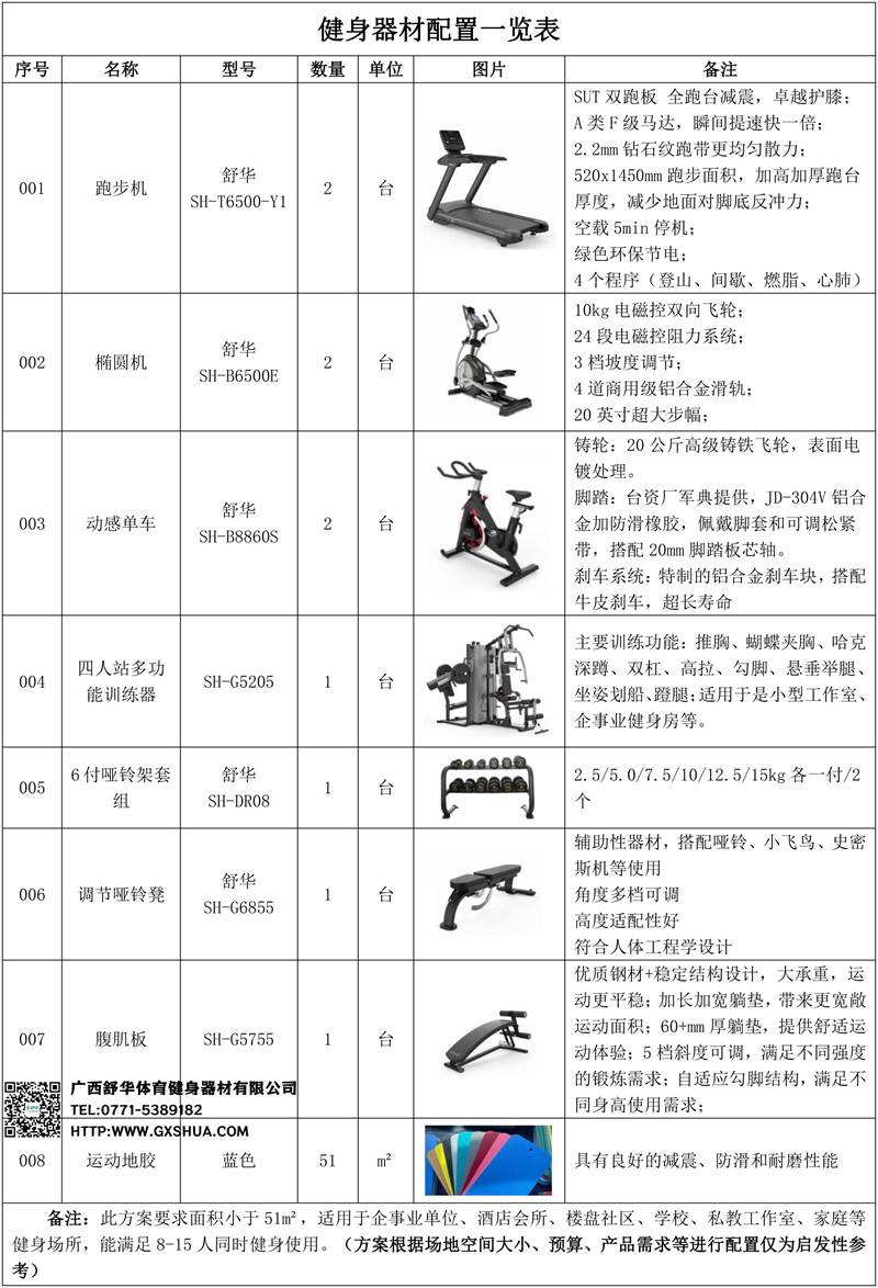 此方案要求面积小于51m²,适用于企事业单位、酒店会所、楼盘社区、学校、私教工作室、家庭等健身场所,能满足8-15人同时健身使用。(方案根据场地空间大小、预算、产品需求等进行配置仅为启发性参考)